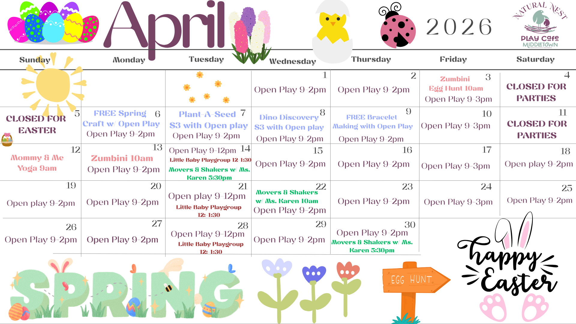 • Get ready to wiggle, wonder, create, and connect! At The Nest, our classes are designed to spark joy, movement, creativity, and connection — all in a warm, welcoming space where little ones feel safe to explore and grow. From music and movement to hands-on enrichment and special themed experiences, every class is thoughtfully crafted with early childhood development (and lots of fun!) in mind.